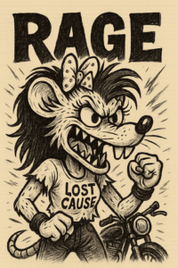 Rage is the blonde rat rebel outlaw who grew up chasing speed, sound, and freedom. She’s the skater who carved up empty parking lots under desert moonlight, the biker who showed up uninvited to rallies just to stir the air, the girl who never once asked for permission.